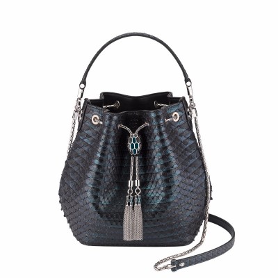 “Serpenti Forever”家族迎来全新杰作:时尚水桶包。这款包采用珍贵的深碧玉色“褶纹”蟒蛇皮材质精制而成,展现BVLGAR I宝格丽以珍贵材料打造经典作品的专业技能。实用的拉绳以BVLGARI宝格丽的方式重新诠释,采用蛇鳞主题链条设计,搭配经典的黑色和深碧玉色珐琅蛇首搭扣和黑色缟玛瑙双眼,尽显魅惑。可拆卸手柄和蛇形链条,以镀钯黄铜制成,令佩戴舒适,多样百搭。小号,单个收纳层,镌刻BVLGAR I宝格丽品牌标识的内侧金属铭牌。